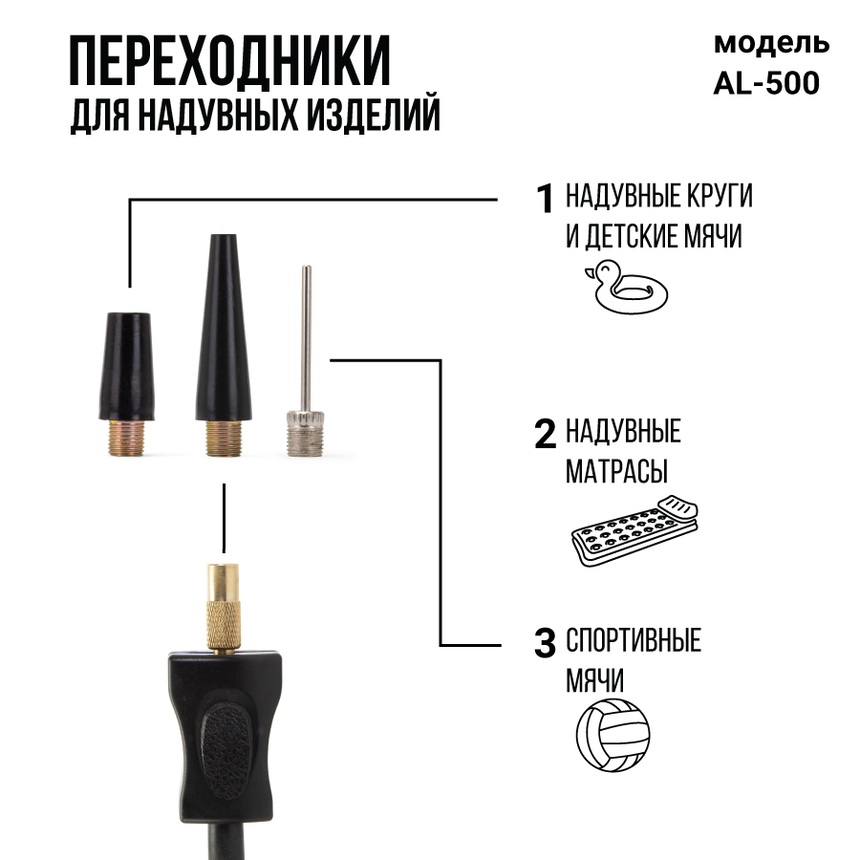Компрессор AL-500 рассчитан практически на любые диаметры автомобильных шин, а также велосипедные шины. Набор переходников для мячей и надувных изделий превращает компрессор в мощное универсальное решение. Питание автокомпрессора осуществляется от автомобильного аккумулятора (зажимы с плавким предохранителем идут в комплекте). Вместе с компрессором покупатель получает удобную сумку для хранения и переноски.