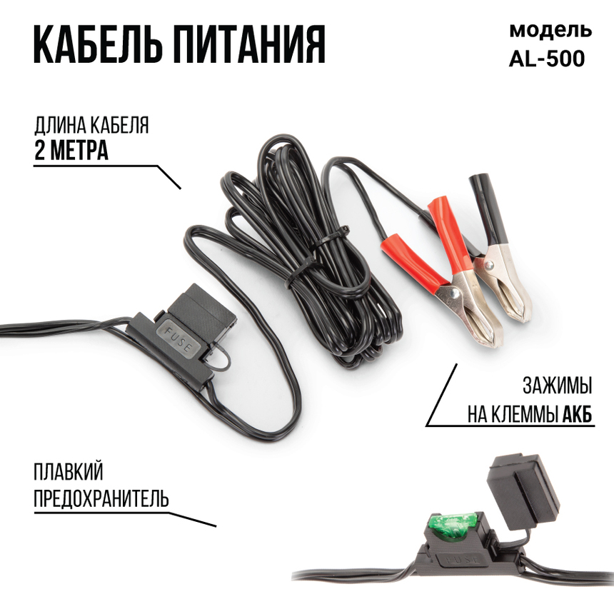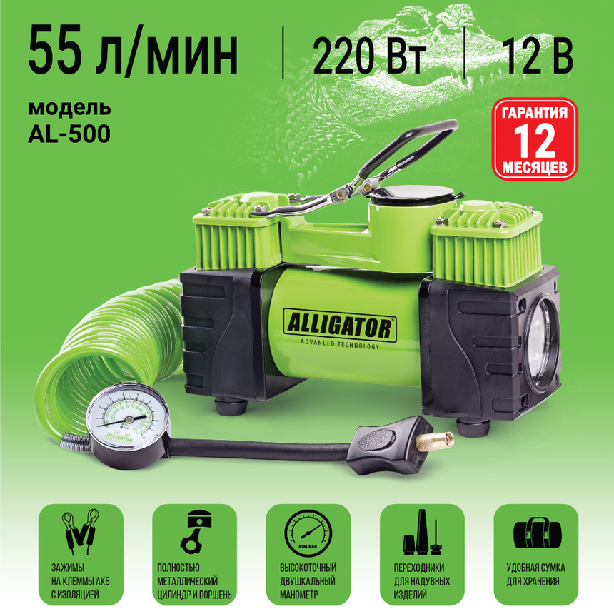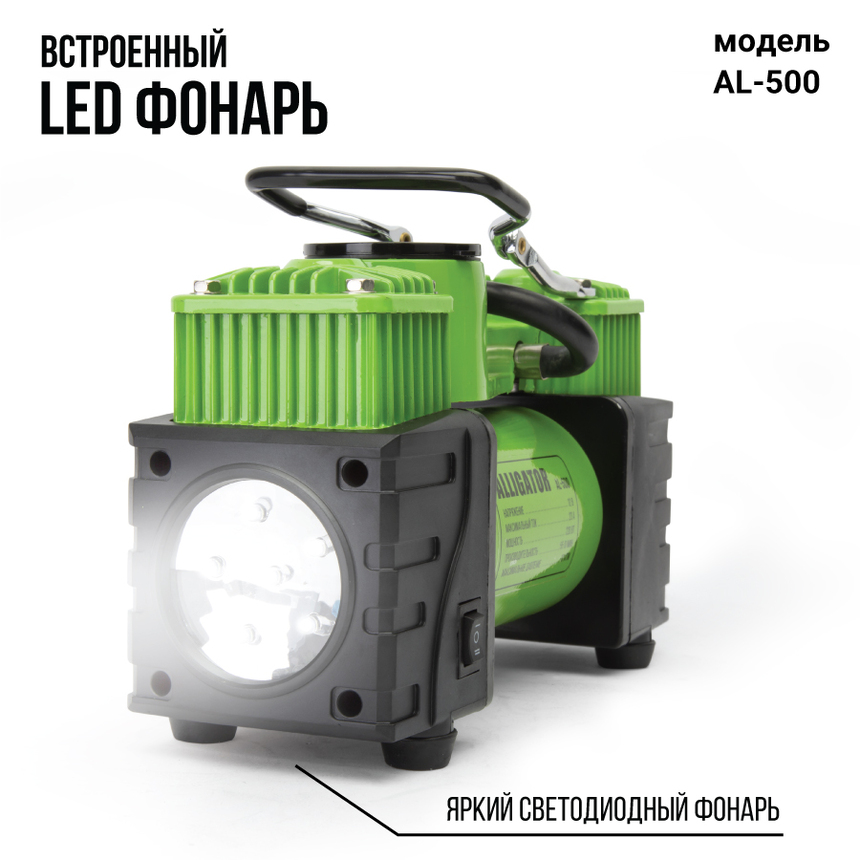 Самая мощная модель серии ALLIGATOR — двухпоршневой компрессор AL-500. Особенности модели: встроенный фонарь, защита от перегрева, шланг-удлинитель длиной 4 м. Два поршня распределяют нагрузку и тем самым снижают износ электродвигателя. Корпус модели сделан из высококачественного металла. Питание компрессора осуществляется от аккумулятора автомобиля, к которому он подключается через зажимы АКБ.