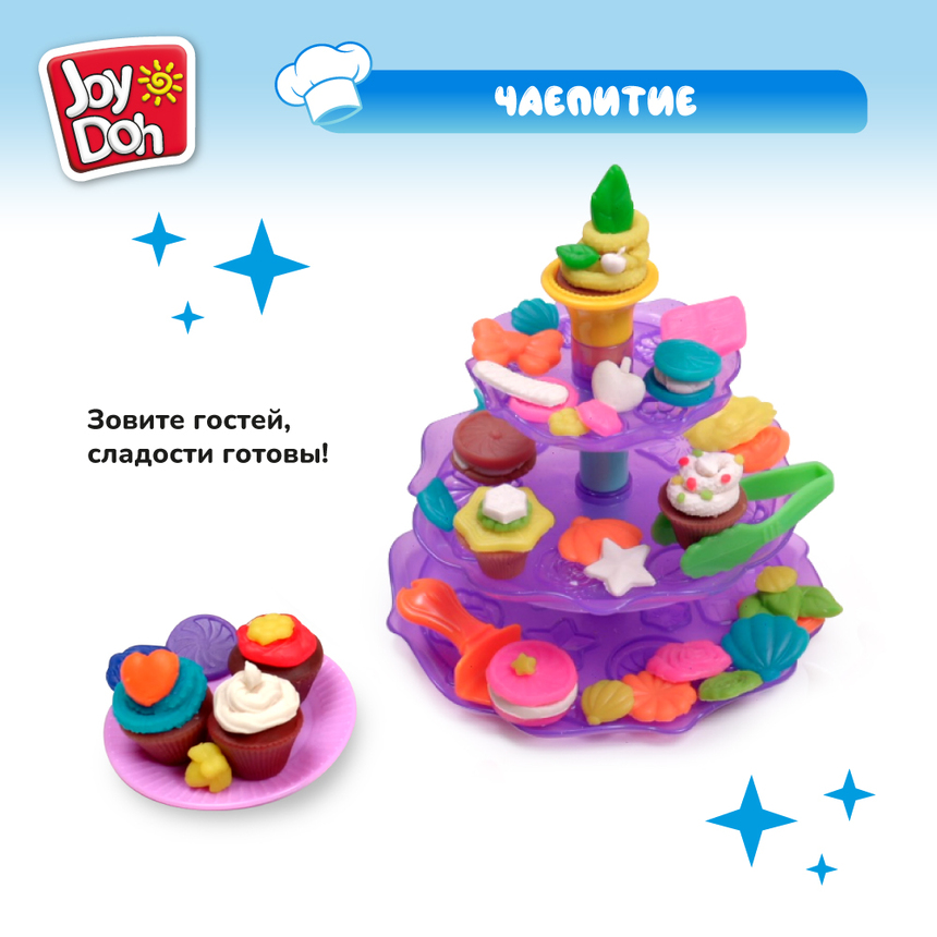 Масса для лепки Joy Doh, набор CUPCAKE TOWER - БАШНЯ СЛАДКОЕЖКИ, 3-х уровневая этажерка, 22 аксессуара, 4 баночки с тестом, (4 х 50 г.)