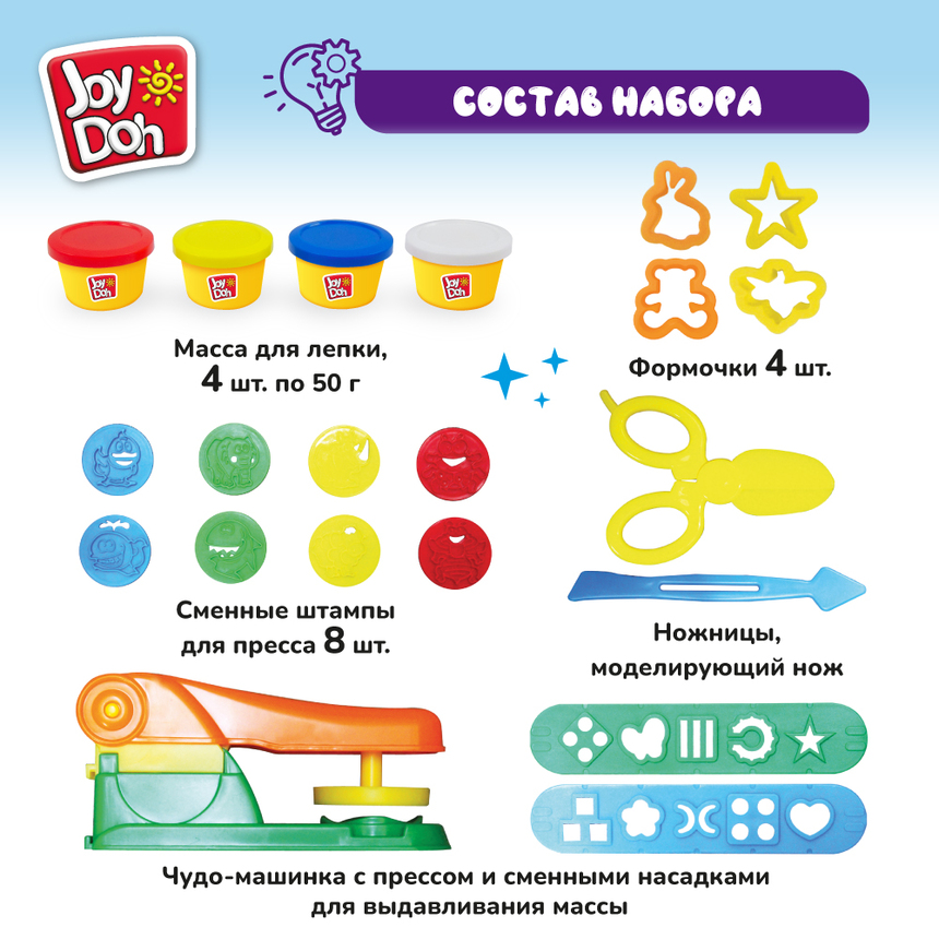Масса для лепки Joy Doh, набор SUPER MACHINE SET - ЧУДО-МАШИНКА, штампы, сменные насадки, 17 аксессуаров ,4 баночки с тестом, (4 x 50 г.)