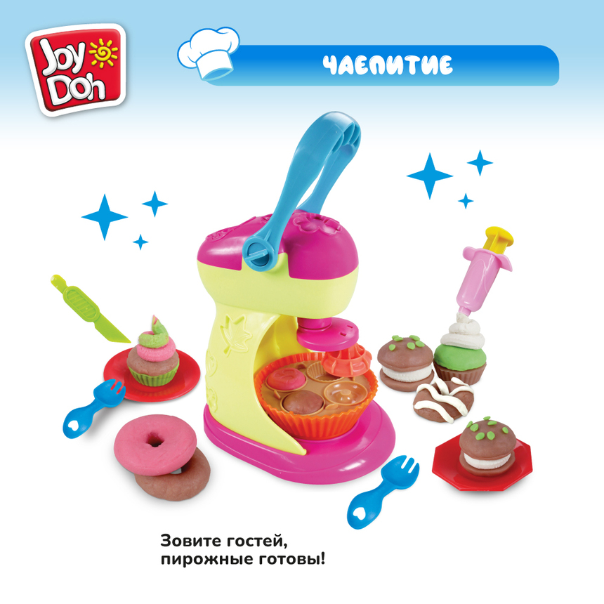 Ваш малыш любит пирожные? Набор для лепки «Spin Pastry Machine» от Joy-Doh – это целая кондитерская! Чудо-машинка для изготовления пирожных: кексы, пончики, макарунсы. Множество пресс-форм для красивых украшений, а специальный кондитерский шприц сделает крем для вкусных лакомств. Ваш ребенок с удовольствием приготовит пирожные и сладости для гостей!
