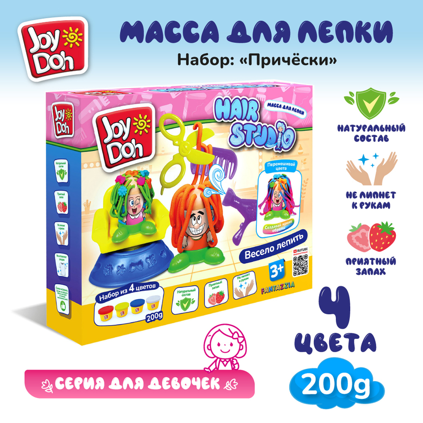Масса для лепки Joy Doh, набор HAIR STUDIO - ПРИЧЕСКИ, сменные насадки, 15 аксессуаров, 4 баночки с тестом, (4 х 50г.)