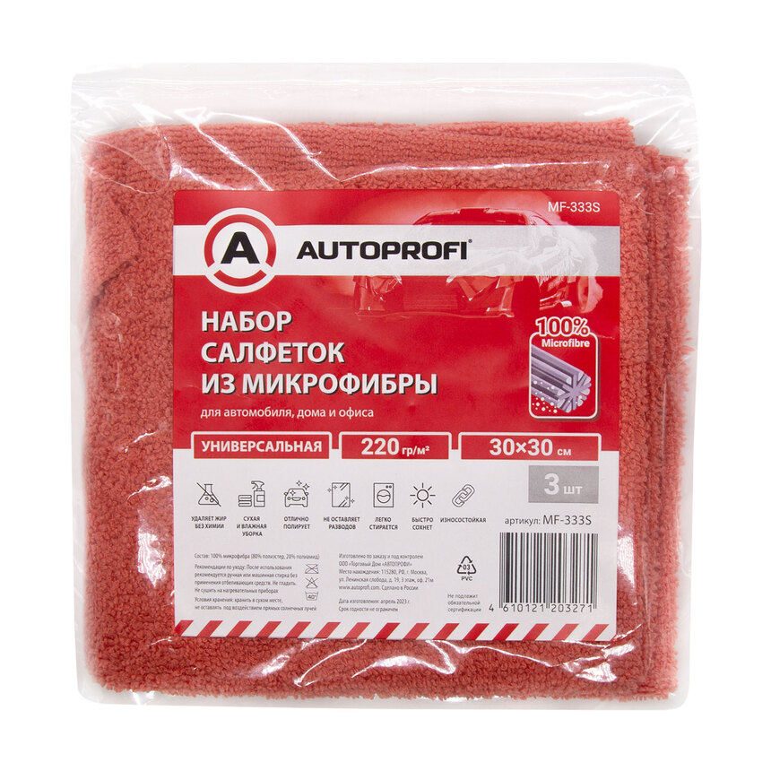 Набор салфеток из микрофибры "AUTOPROFI" стандарт, 220 гр/м2., 30х30 см., 3шт. MF-333S