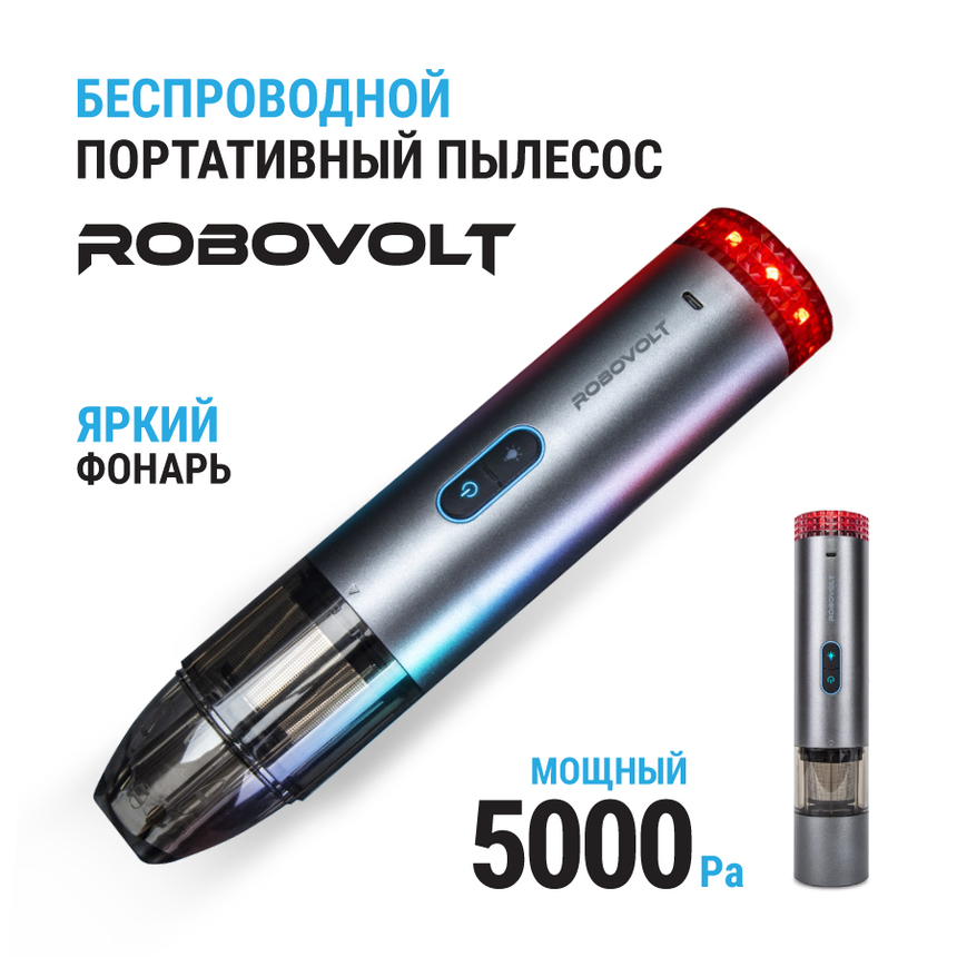 Пылесос беспроводной ROBOVOLT V6, портативный, 80W, 5000 Pa, батарея 7.4V * 2200 mA / 2шт., фильтр HEPA, 2 насадки, LED фонарь, магнитная крышка, зарядка micro USB 5V 1,8A, сумка